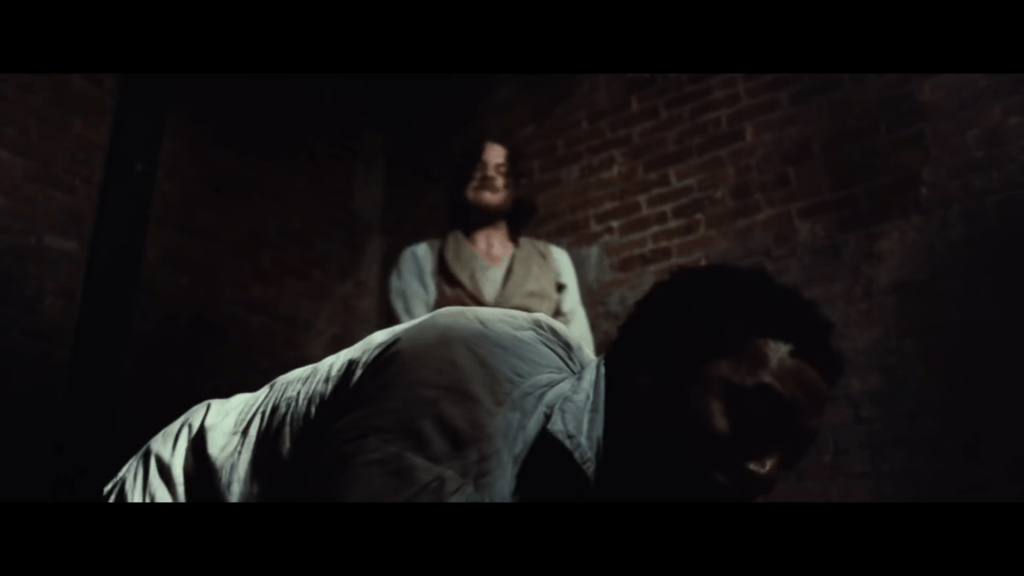 I think this view underestimates Tyler’s performances. For me they are acts of parody, and in this case I see that he is ridiculing his audience. The shirtless, somewhat expressionless Tyler, murders the other Tylers. In the final performance this so-called new Tyler brutally beats old Tyler. Rather than an act of retribution, redemption or rebirth (as interpretations here and here suggest) this seems to me just another performance of self that is demanded by the audience. This scene presents as a deliberate and intentional parody of the desire for brutalisation of black men (below middle, a still from the horrible 12 Years A Slave (McQueen, S., dir., ’12 Years A Slave’ [Film], 2013.) is for comparison).