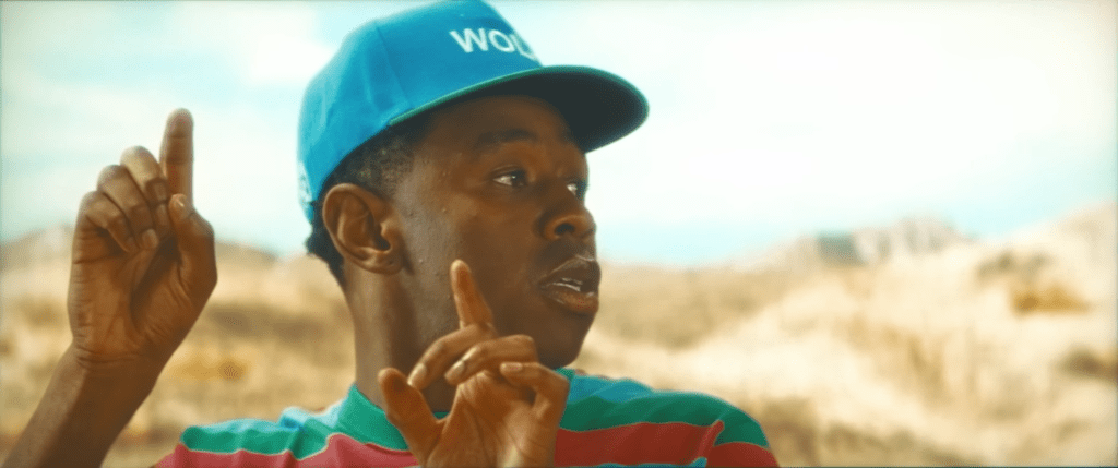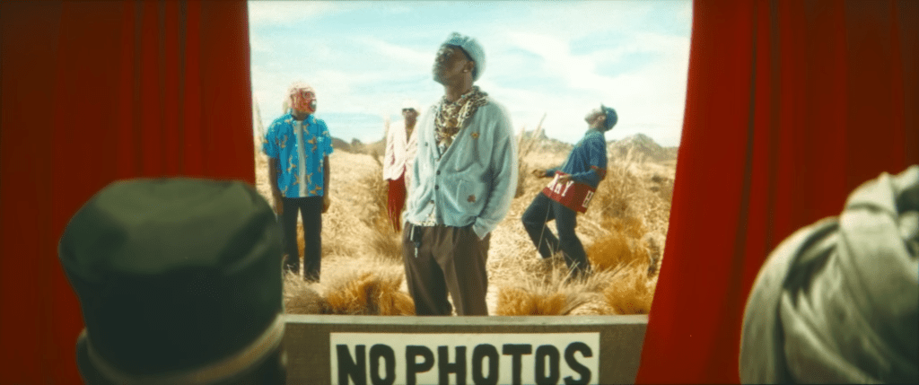 In the music video of Sorry Not Sorry, Tyler The Creator’s personas appear on a stage, with a Music Hall feel. An audience traipses in before the scene is revealed.