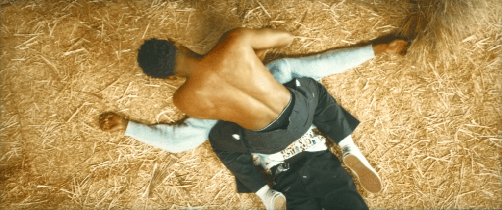 The scene – as observed by the audience on the other side of a red curtain, and the eager and hungry ‘fans’ at home watching through a screen – is evocative of the continuous presentation of black men in the performance of death and dying. That in Tyler’s scenes he is inflicting this on himself, absolves the audience of any need for responsibility or action.